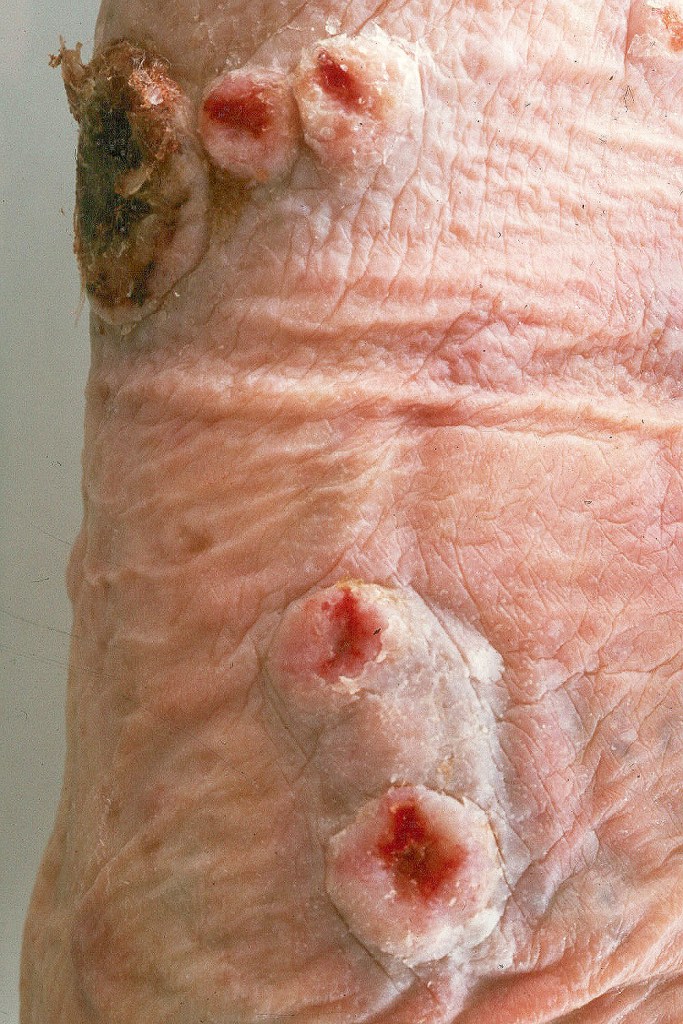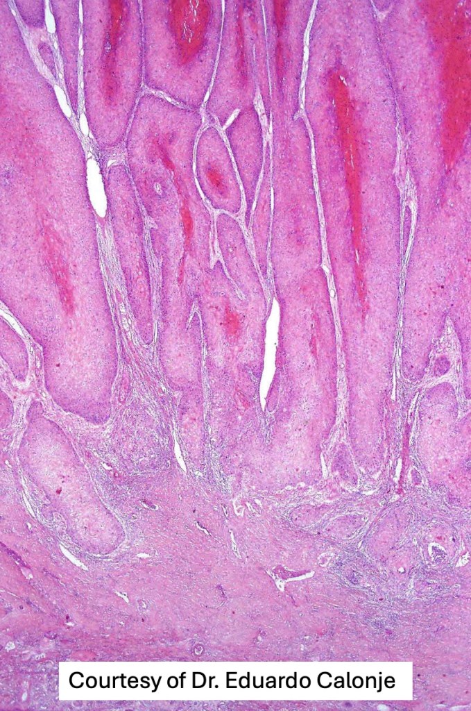 •Warty lesions with conspicuous keratin-filled sinuses (carcinoma cunniculatum due to its resemblance to a rabbit warren; Latin cunniculus- rabbit, warren)