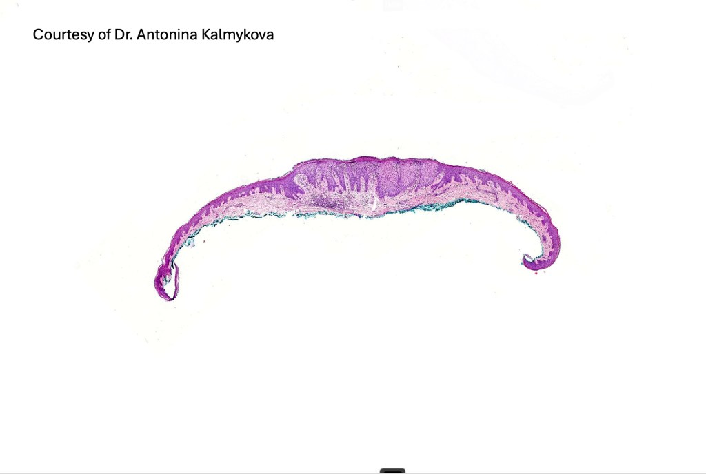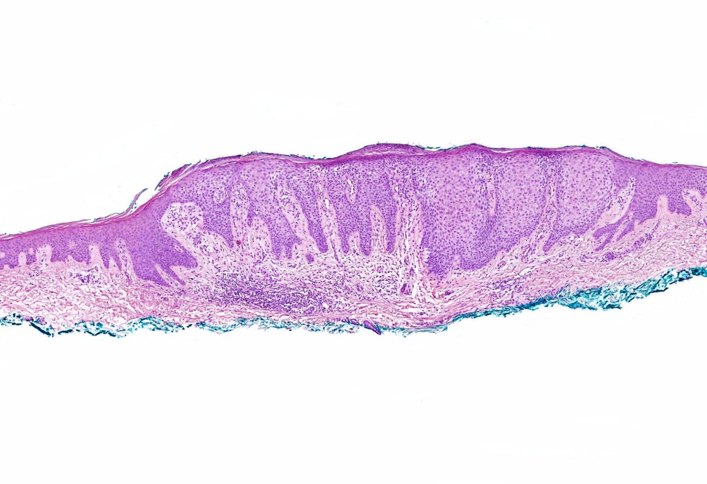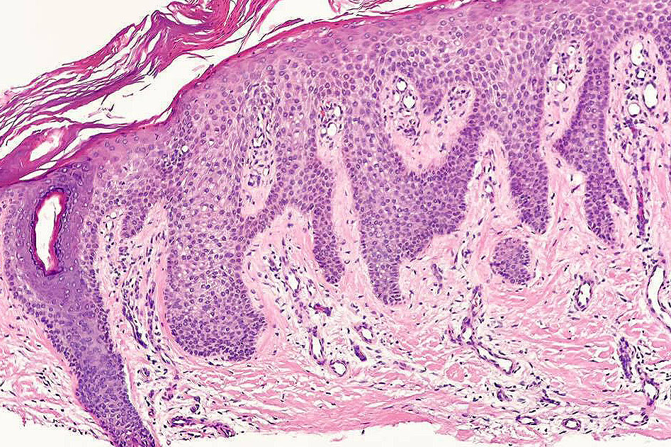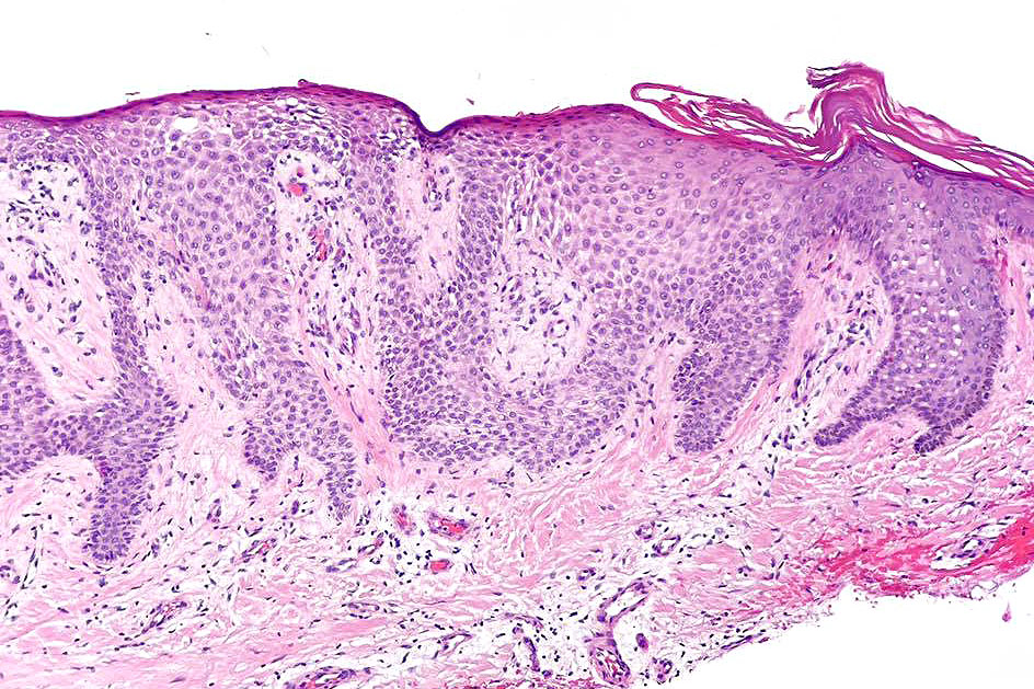 •Sharply demarcated acanthosis/psoriasiform hyperplasia; bland epithelium