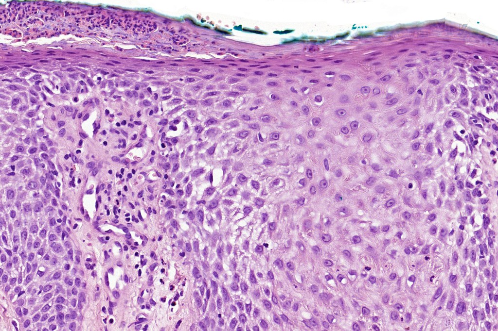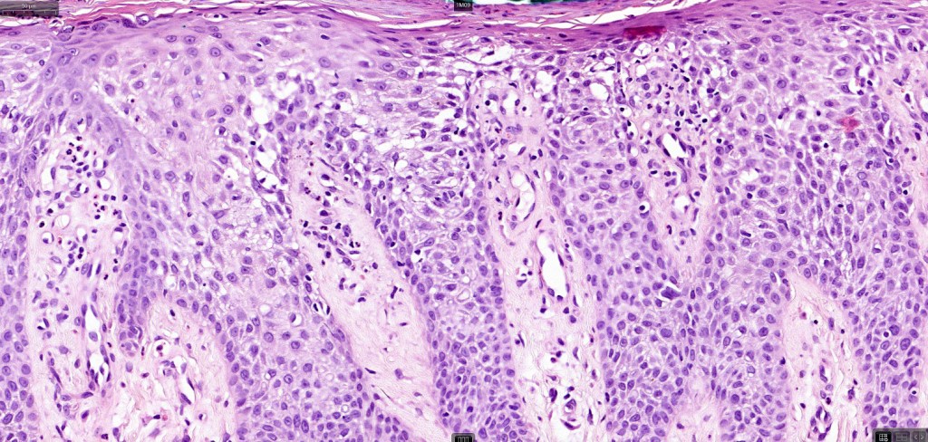 •Cytoplasmic pallor or clear cell change; spongiosis sometimes present