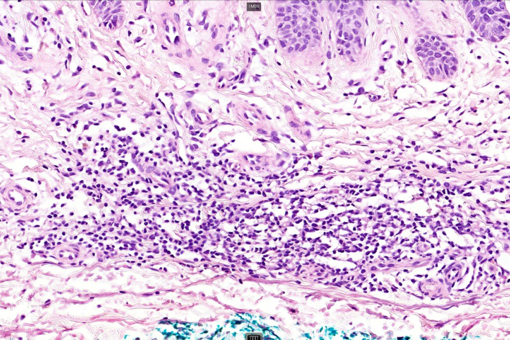 •Vascular dilatation in the dermal papillae and a perivascular sometimes neutrophil-rich infiltrate