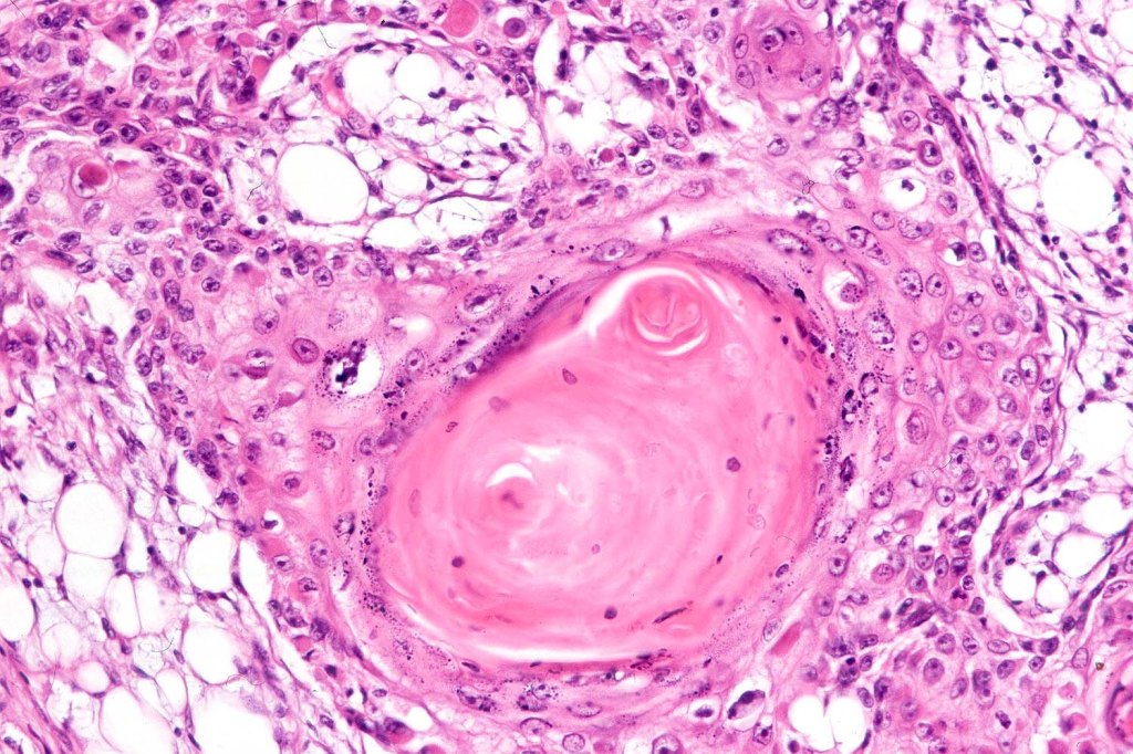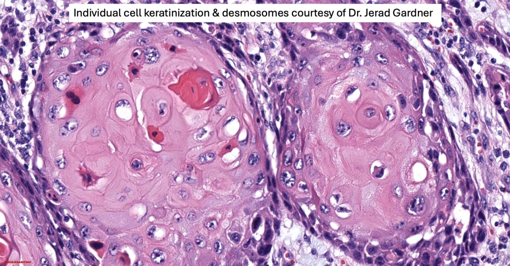 . Presence of desmosomes, individual cell keratinization, keratin pearls, keratocysts