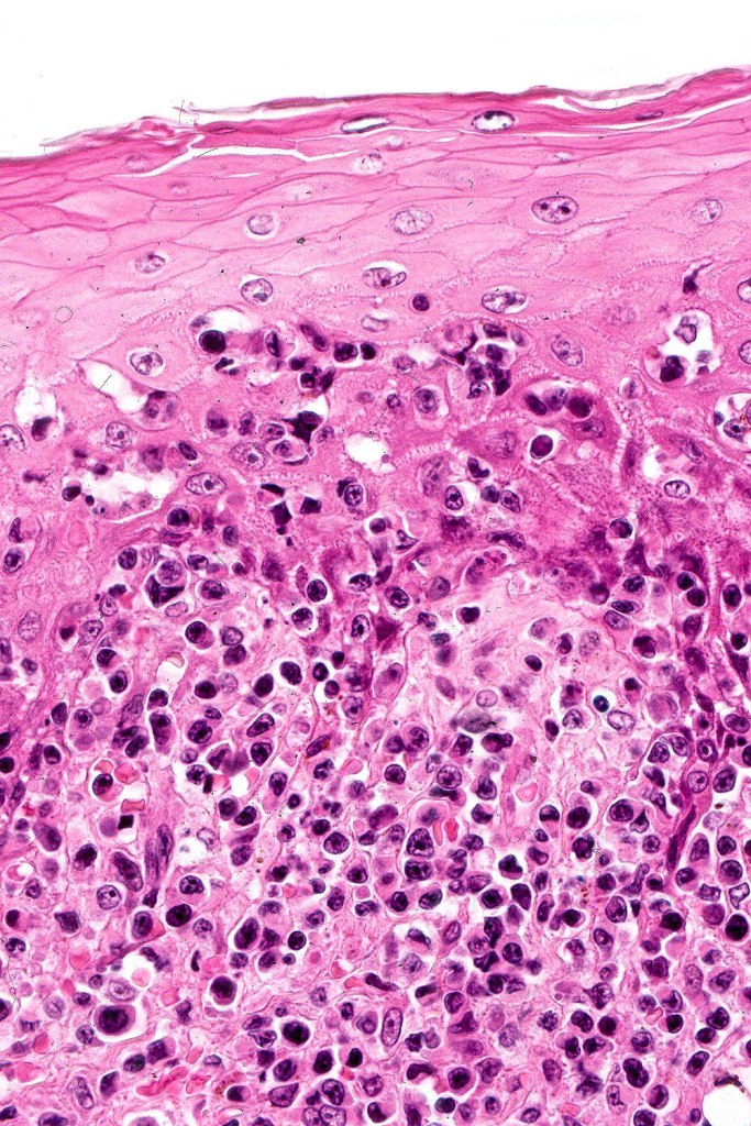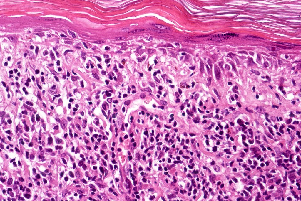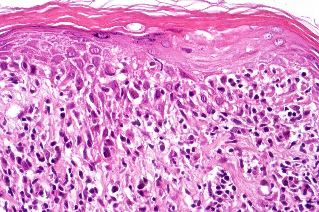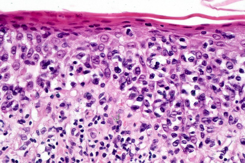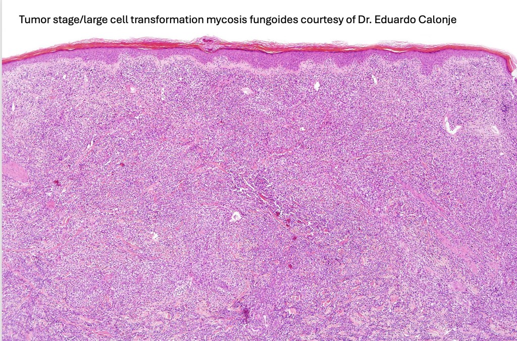 The histological hallmark of mycosis fungoides is the presence of large atypical lymphocytes with a convoluted/cerebriform nuclear border (Sézary cells). These may be found at the epidermal-dermal jnuction and as collections within the epidermis (Pautrier microabscess). These are most easily found in plaque stage disease. The epidermal component can be subtle in patch stage disease and is often lost in tumor stage dsease. The classification into patch, plaque & tumor stage disease is less helpful histologically as the features merge from one to the other. It is all a matter of degree.