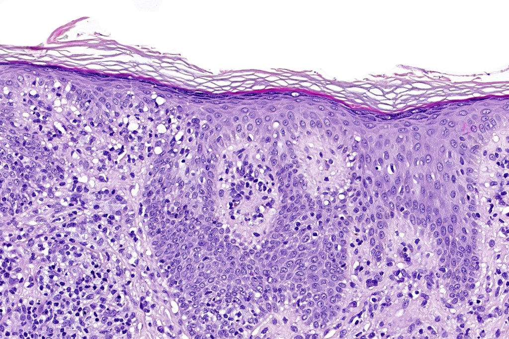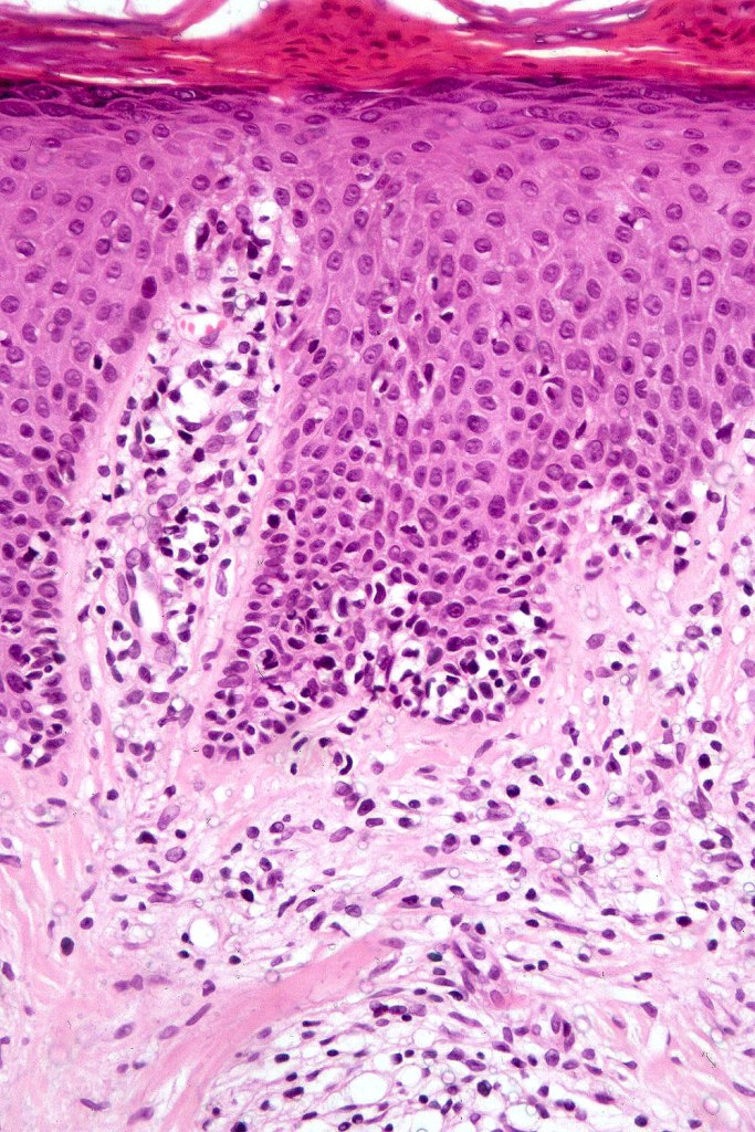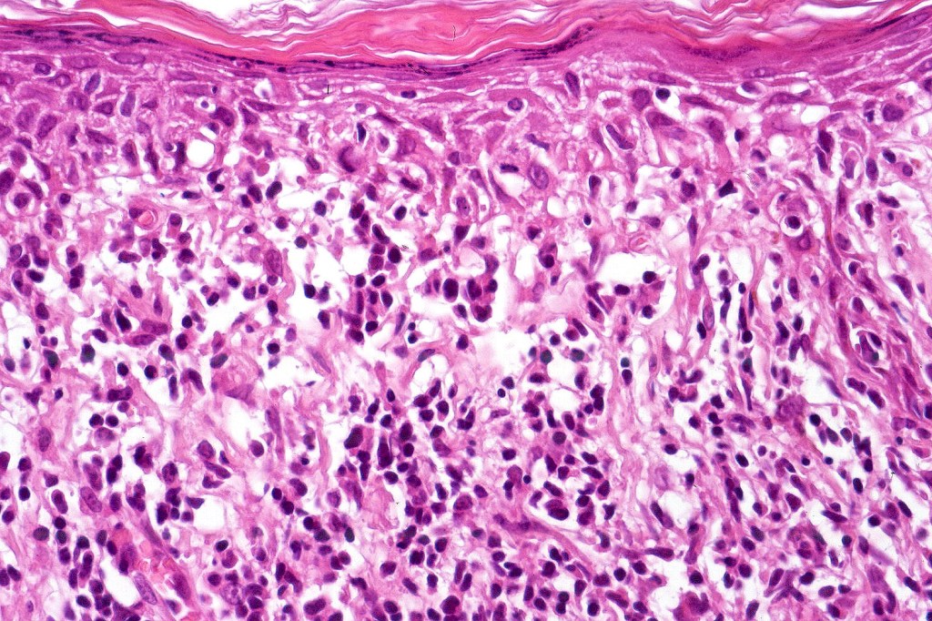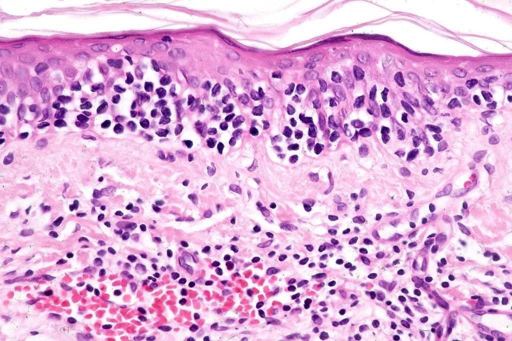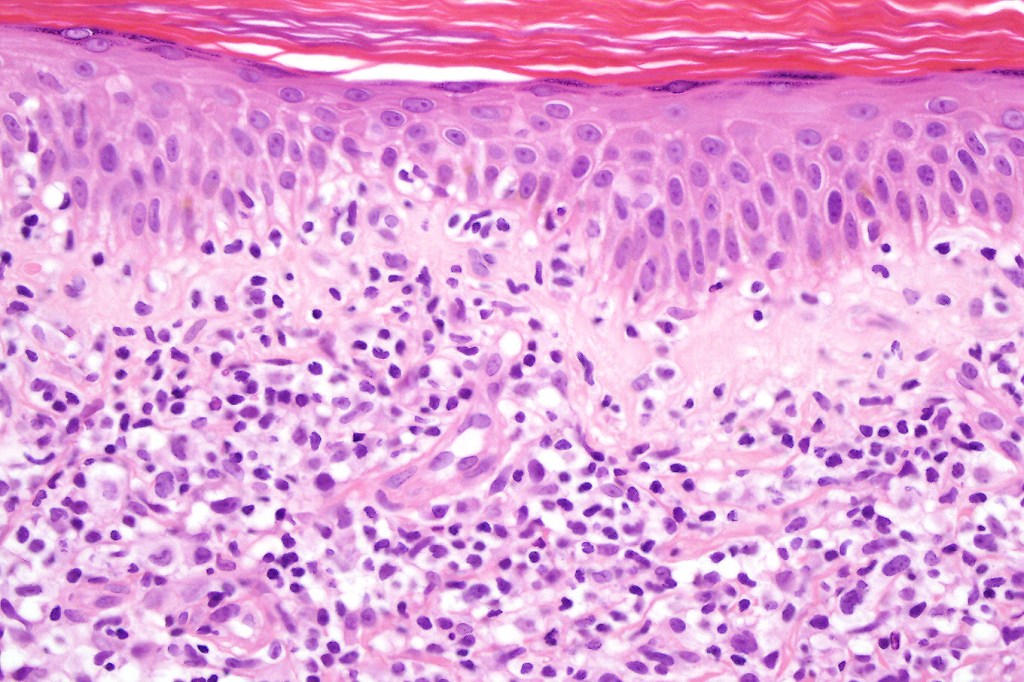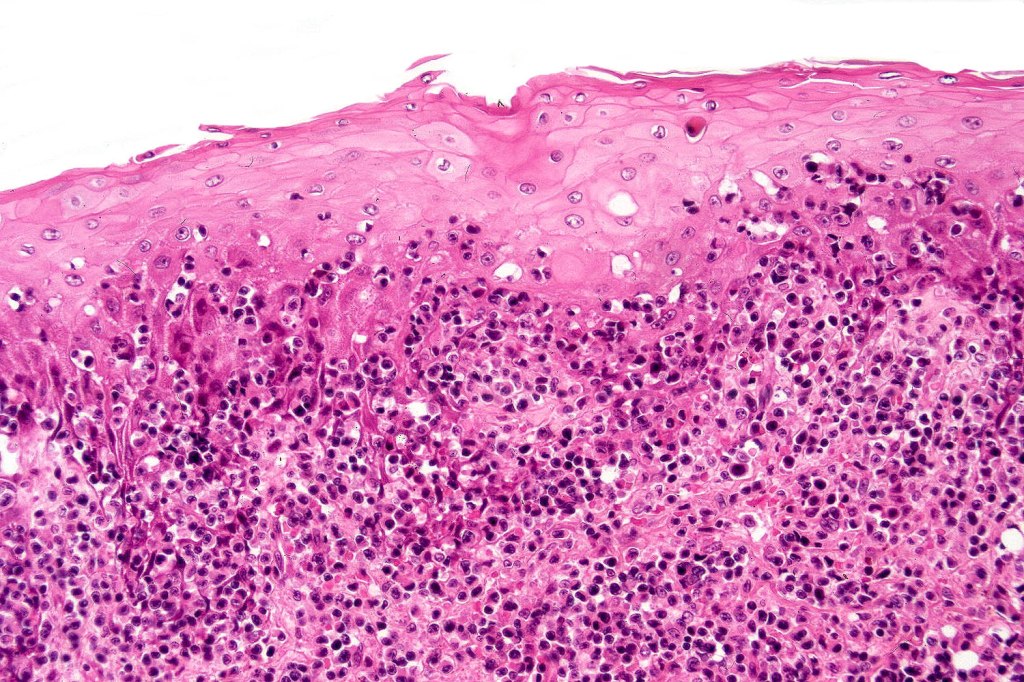 The histological hallmark of mycosis fungoides is the presence of large atypical lymphocytes with a convoluted/cerebriform nuclear border (Sézary cells). These may be found at the epidermal-dermal jnuction and as collections within the epidermis (Pautrier microabscess). These are most easily found in plaque stage disease. The epidermal component can be subtle in patch stage disease and is often lost in tumor stage dsease. The classification into patch, plaque & tumor stage disease is less helpful histologically as the features merge from one to the other. It is all a matter of degree.