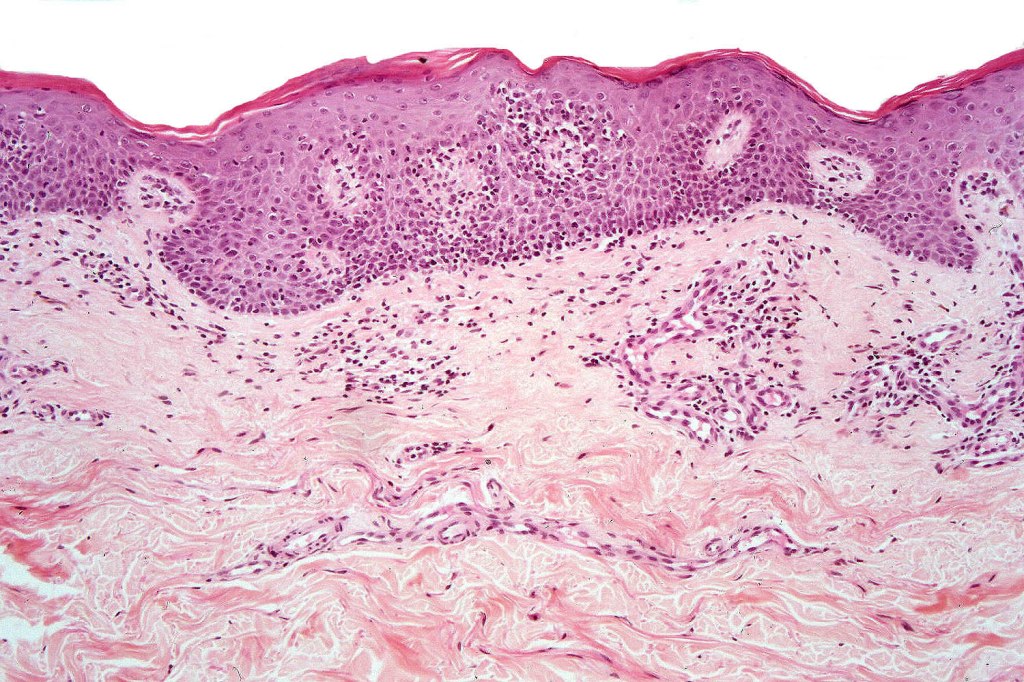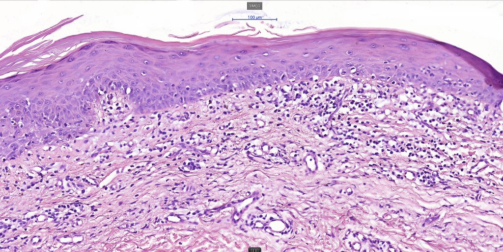 •Coarse collagen bundles in the papillary dermis can be a feature but this is not as marked as seen in plaque disease