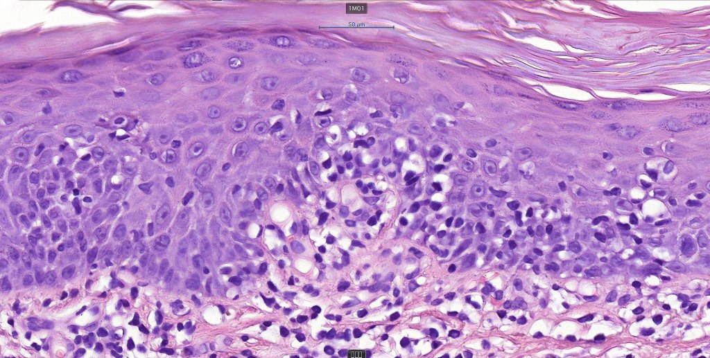 •Palisading of atypical lymphocytes along the epidermal-dermal border