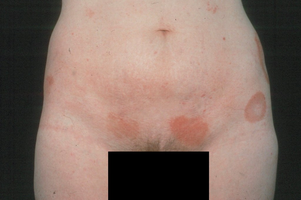 •Patch stage disease is characterized by erythematous, scaly lesions with a predilection for the trunk, limb girdles, breasts & flexures; variably sized and shaped