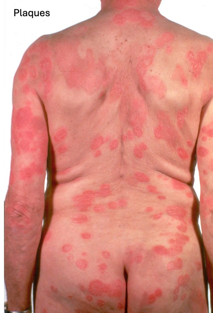 •Plaque stage disease is characterized by scaly, erythematous scaly plaques sometimes with an annular or serpiginous morphology