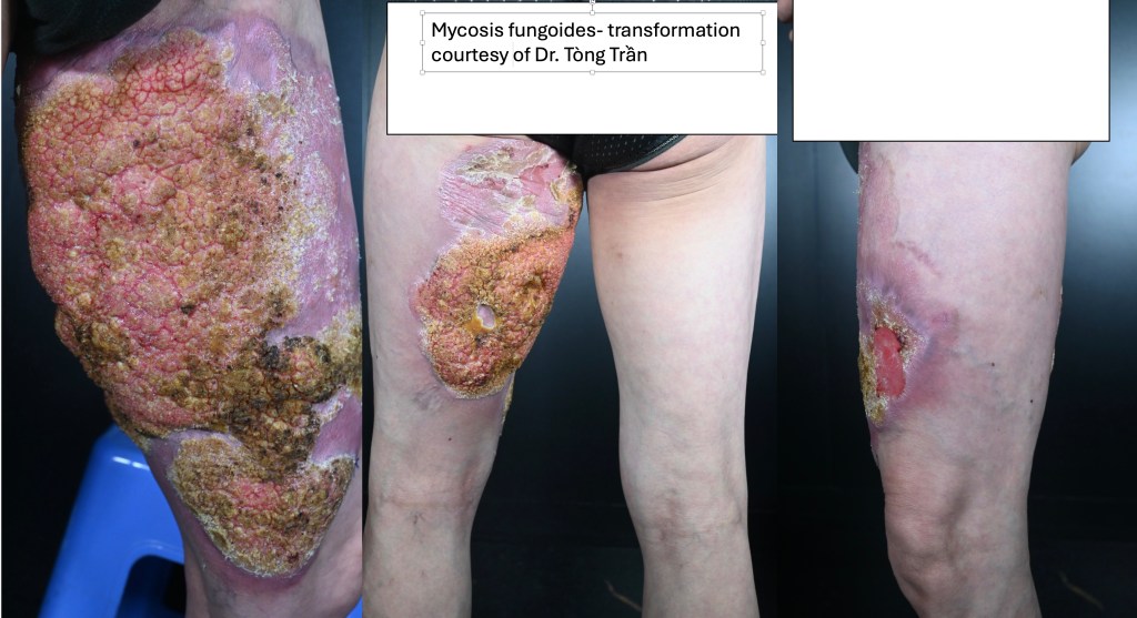 •Rare clinical variants include bullous, hypopigmented, pustular, papular, granulomatous, palmoplantar psoriasiform , acanthosis nigricans-like mycosis, hypopigmented, hyperpigmented, vesiculobullous, pustular, pigmented purpura-like, unilesional, verrucous & invisible (severe pruritus with no visible skin lesions). One patient that I encountered could regularly predict devlopment of a new lesion long before it was clinically apparent just on the basis of a “new itch”.