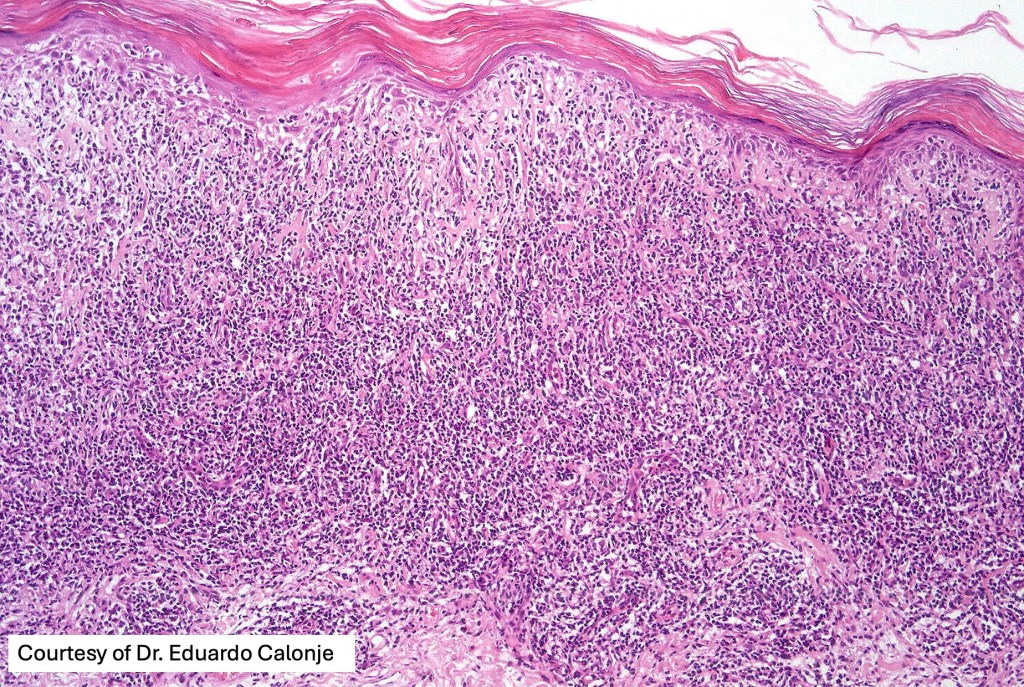 •Superficial band-like dermal infiltrate of atypical lymphocytes, eosinophils, plasma cells & histiocytes