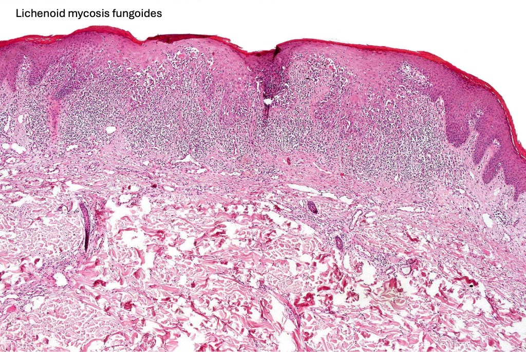 Lymphomatoid drug reaction can sometimes show histological features very similar to patch stage disease. Distinction is very much dependant on clinicopathological correlation.