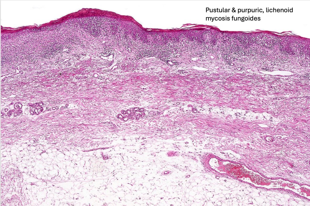 •Important variants of mycosis fungoides include poikiloderma atrophicans vasculare (poikiodermatous mycosis fungoides, large plaque parapsoriasis), erythrodermatous mycosis fungoides (not to be confused with Sézary syndrome), syringotropic & folliculotropic mycosis fungoides, Pagetoid reticulosis & granulomatous slack skin, mycosis fungoides in children & adolescents (these are all described in separate blogs)