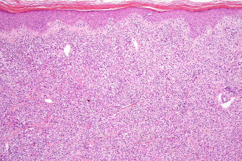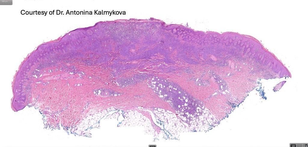 •Dense, broad diffuse or nodular, dermal infiltrate often extending into the subcutaneous fat