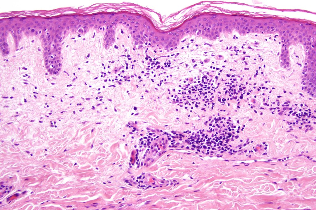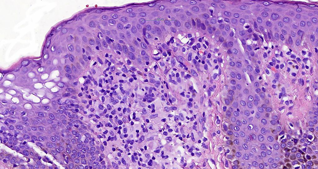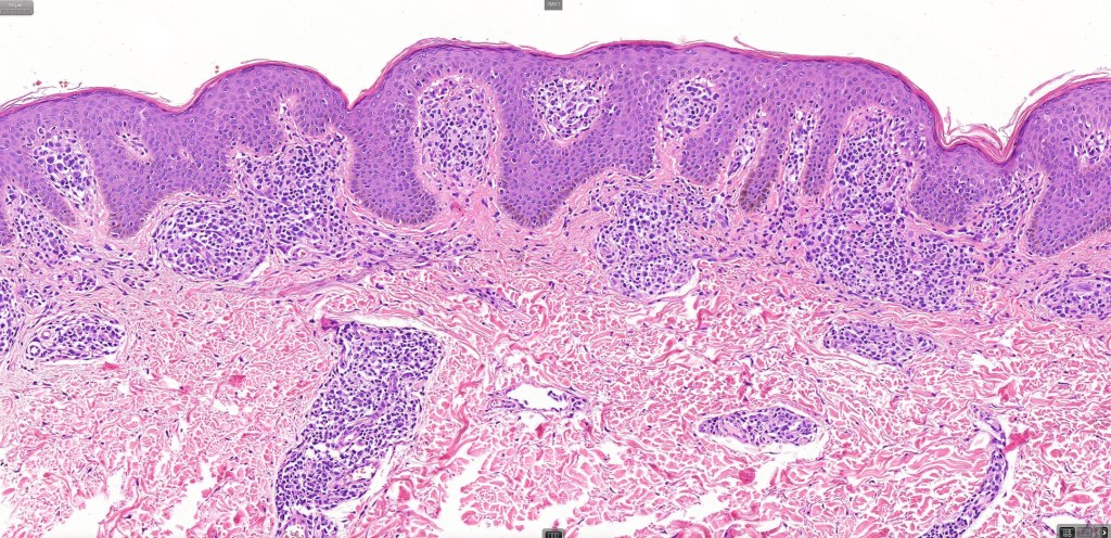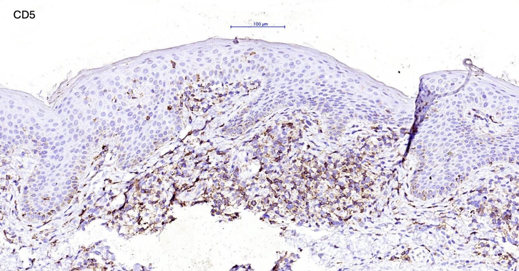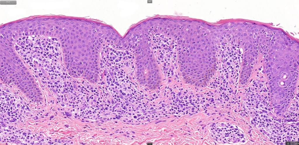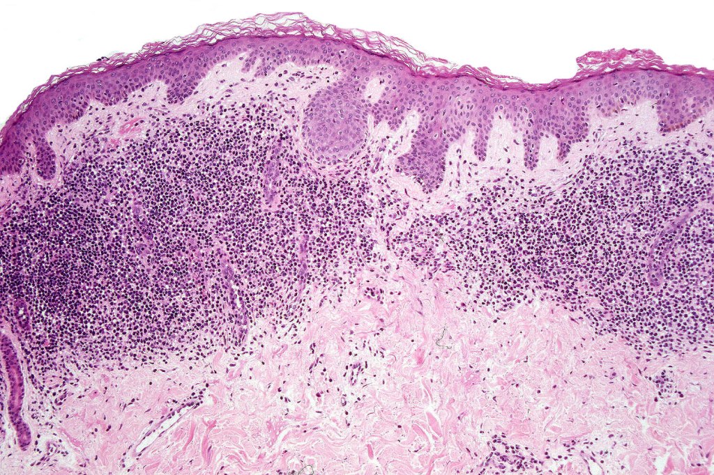 •Variable histological features ranging from a non-specific superficial perivascular or band-like dermal infiltrate with minimal or no epidermotropism through to mycosis fungoides-like histology; can mimic atopic dermatitis