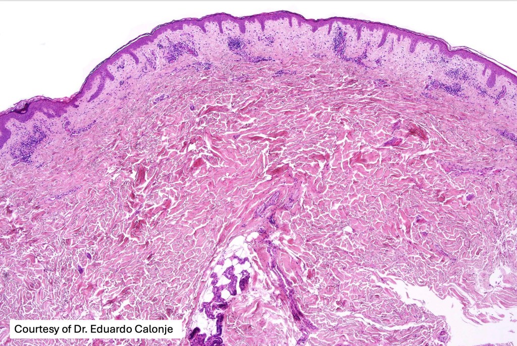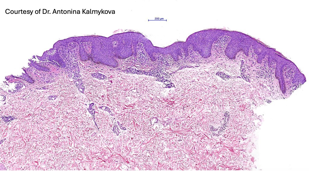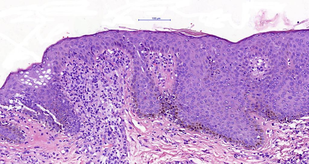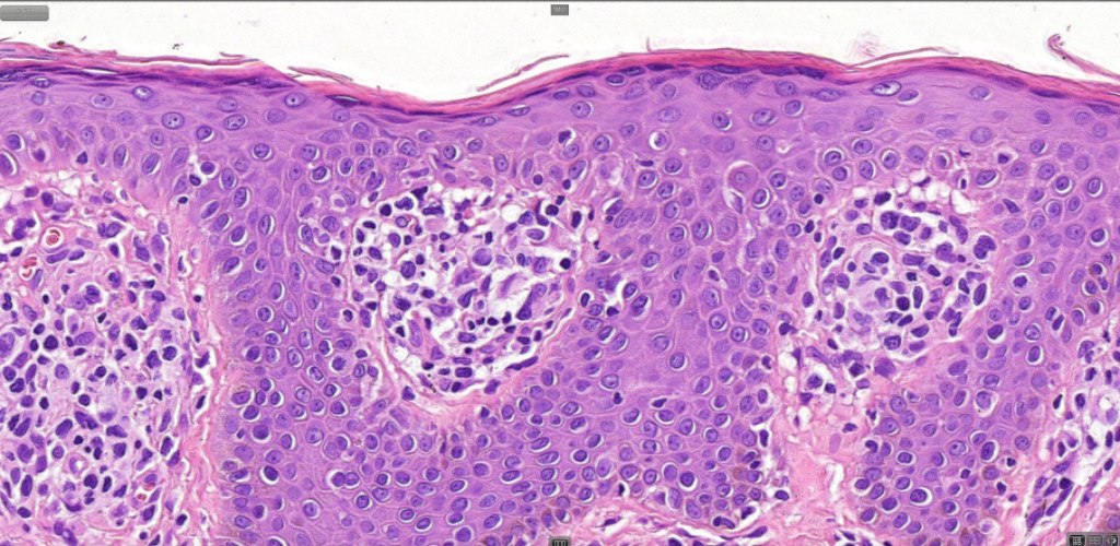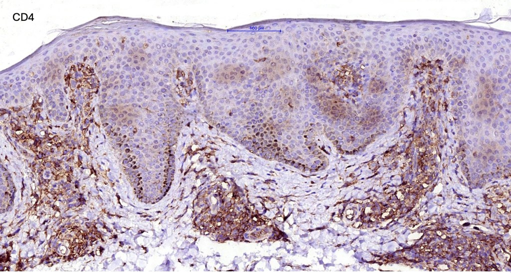 •Variable histological features ranging from a non-specific superficial perivascular or band-like dermal infiltrate with minimal or no epidermotropism through to mycosis fungoides-like histology; can mimic atopic dermatitis