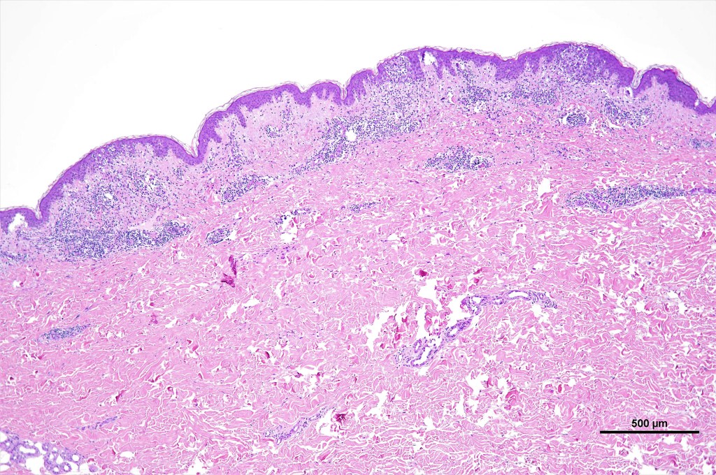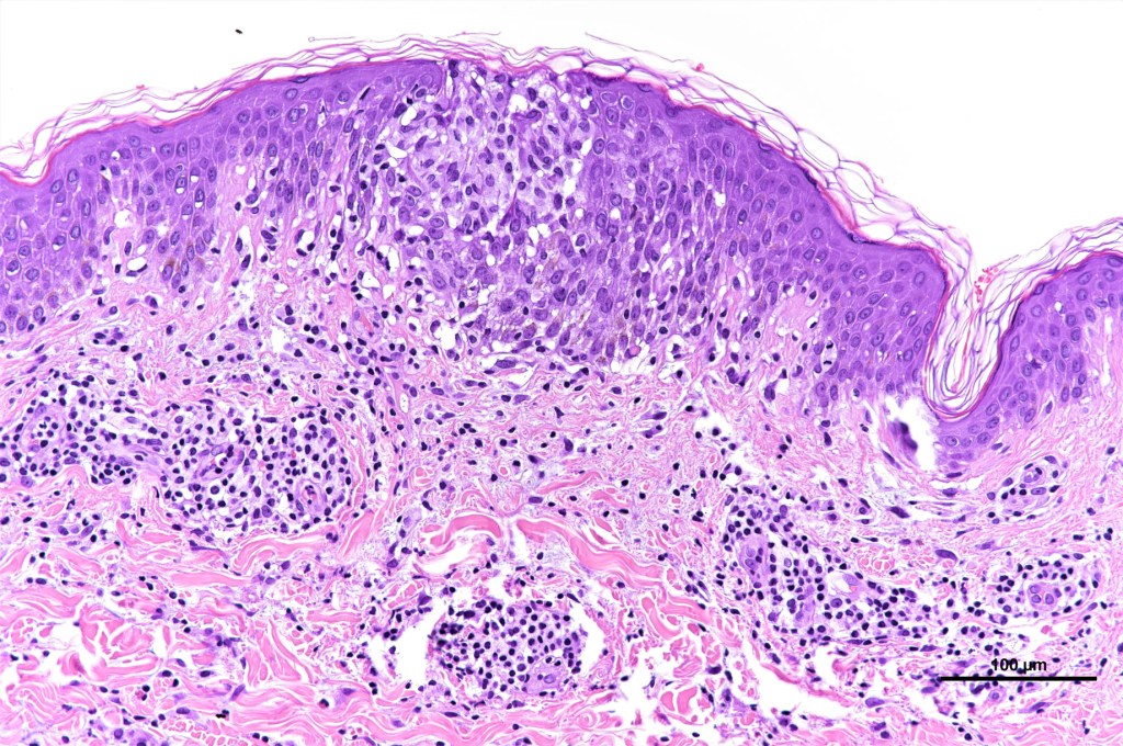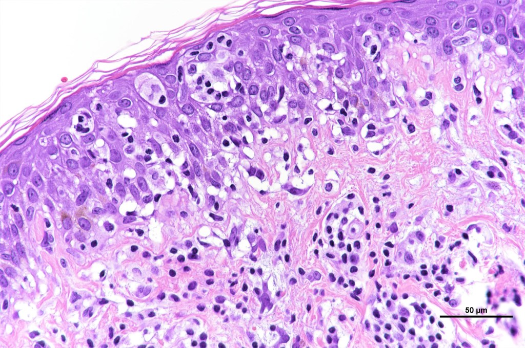•Variable epidermal necrosis, epidermotropism, edema, hemorrhage & vasculitis/thrombosis