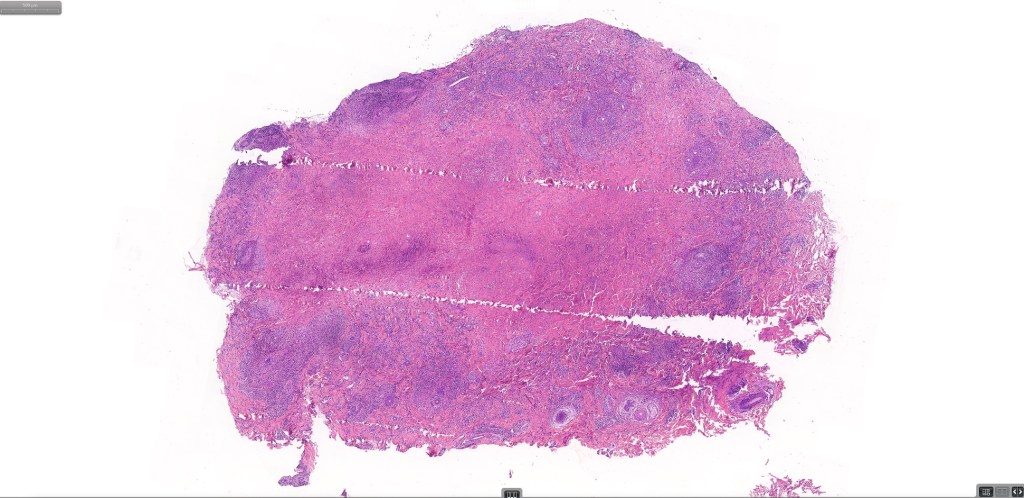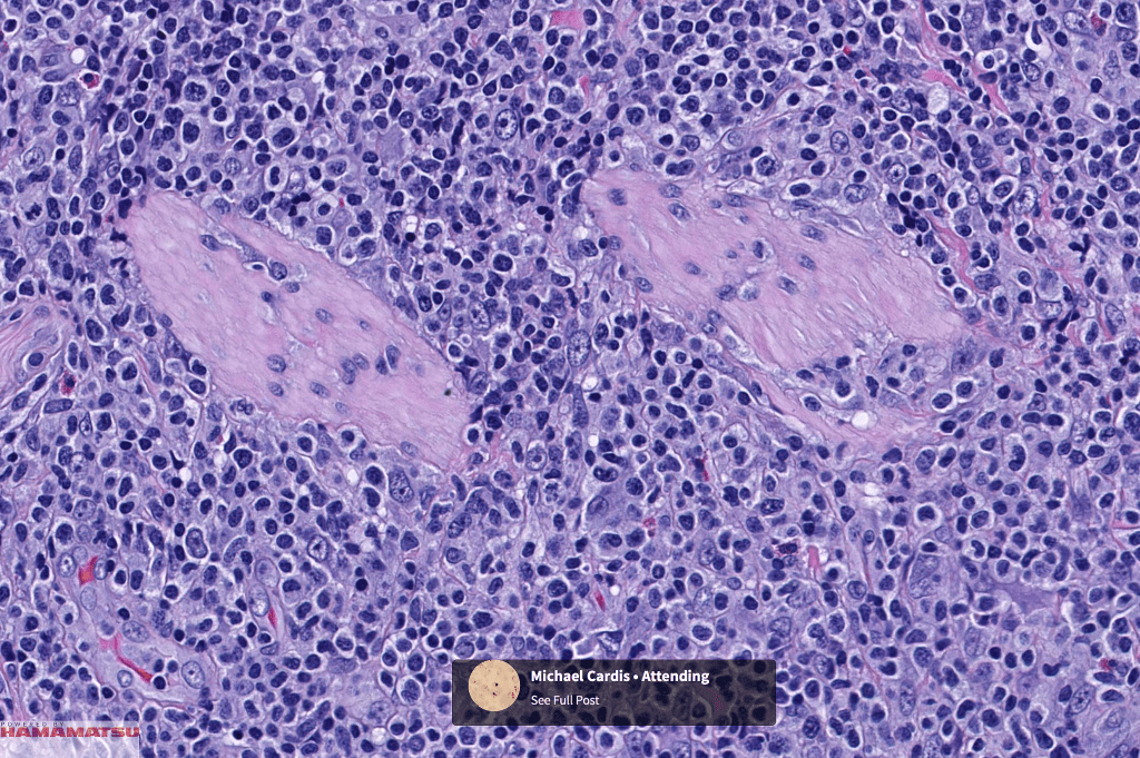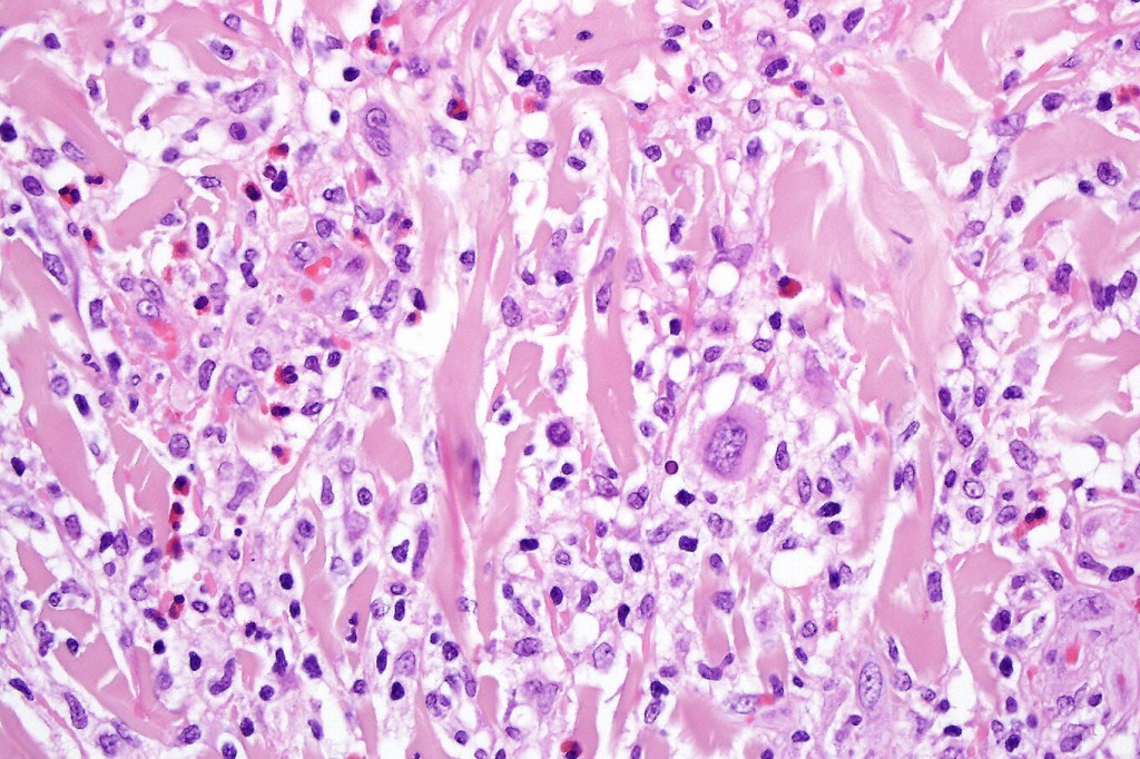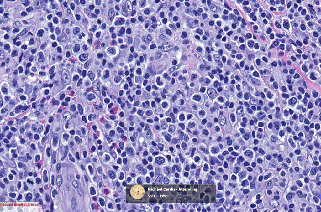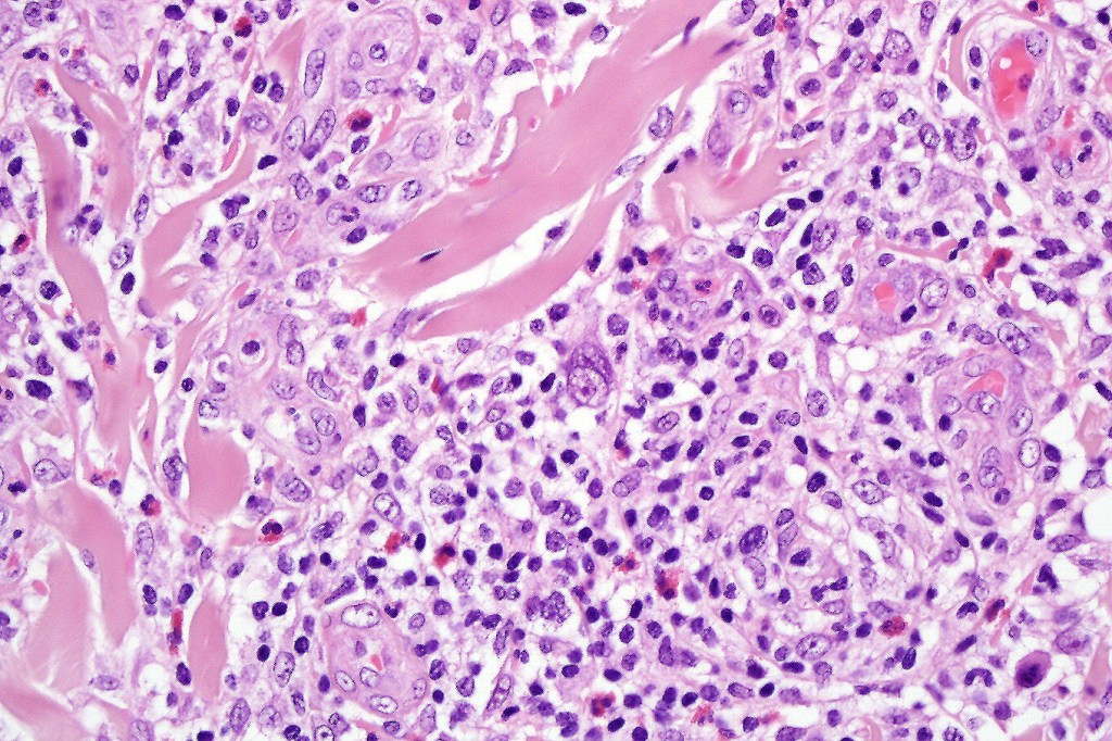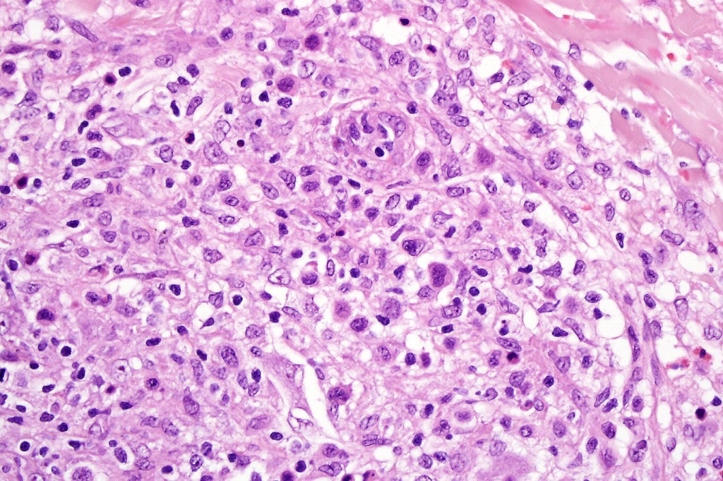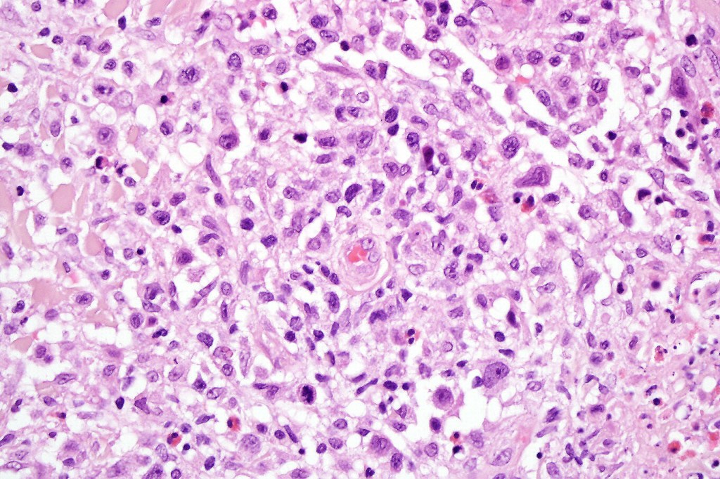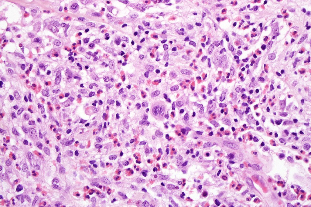 •Type A: 75-80%, wedge shaped infiltrate with base uppermost, large, anaplastic cells with abundant cytoplasm and vesicular nuclei containing prominent nucleoli, can resemble Reed-Sternberg cells, conspicuous mitoses & background infiltrate of lymphocytes, plasma cells, histiocytes, neutrophils & eosinophils