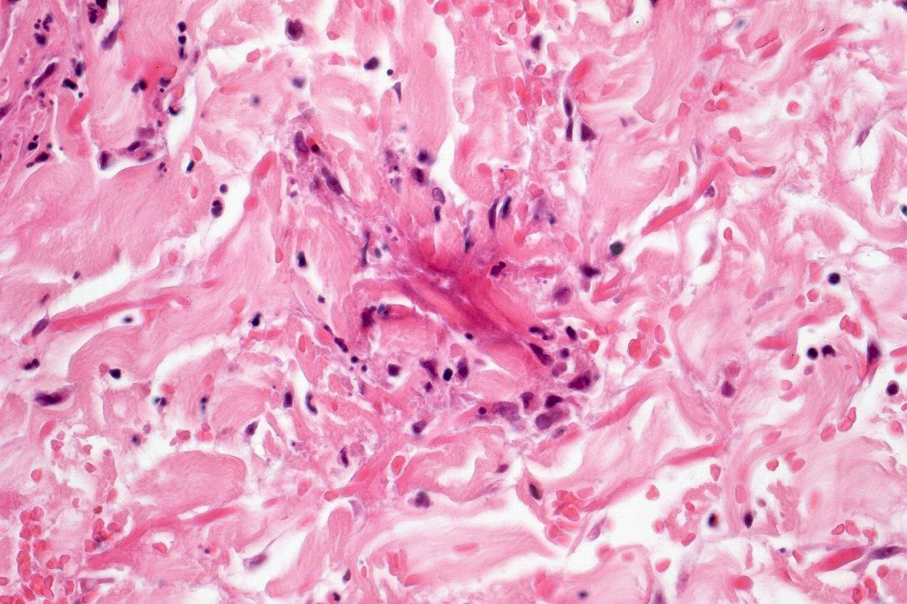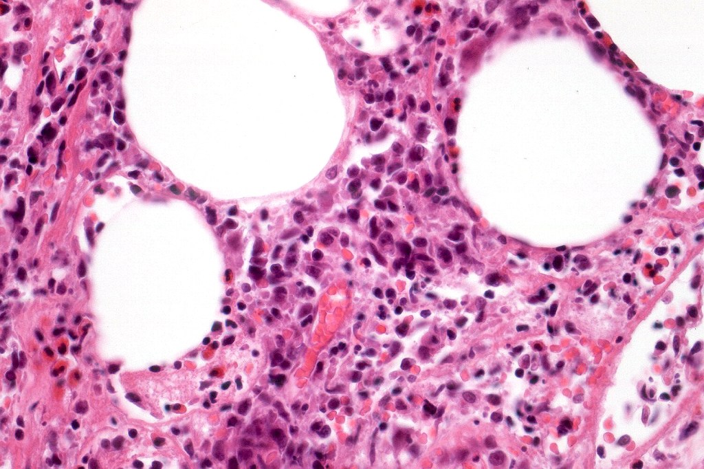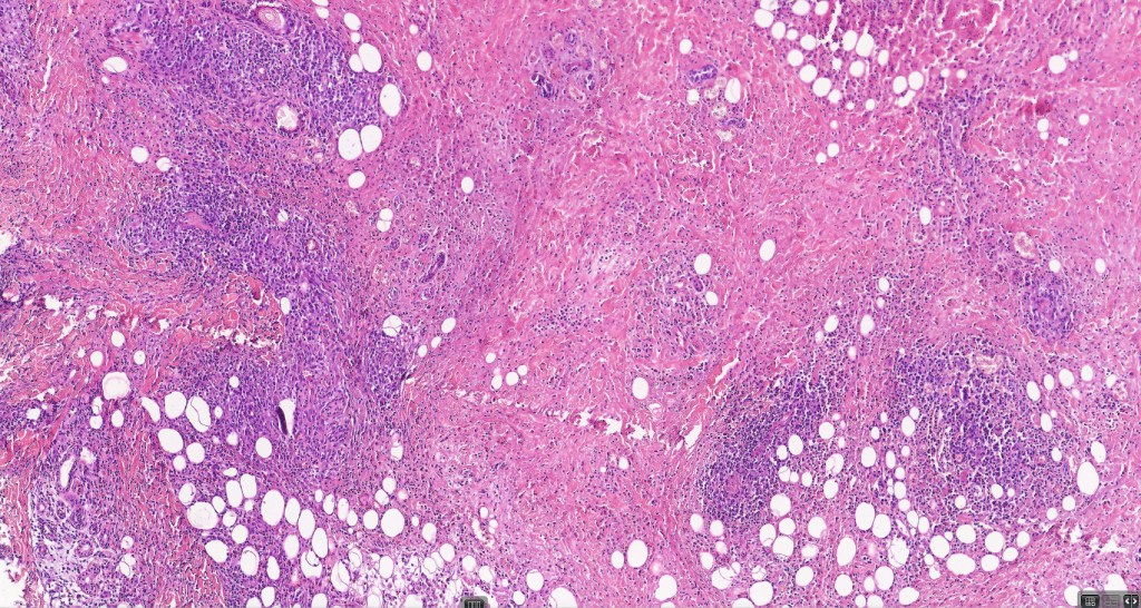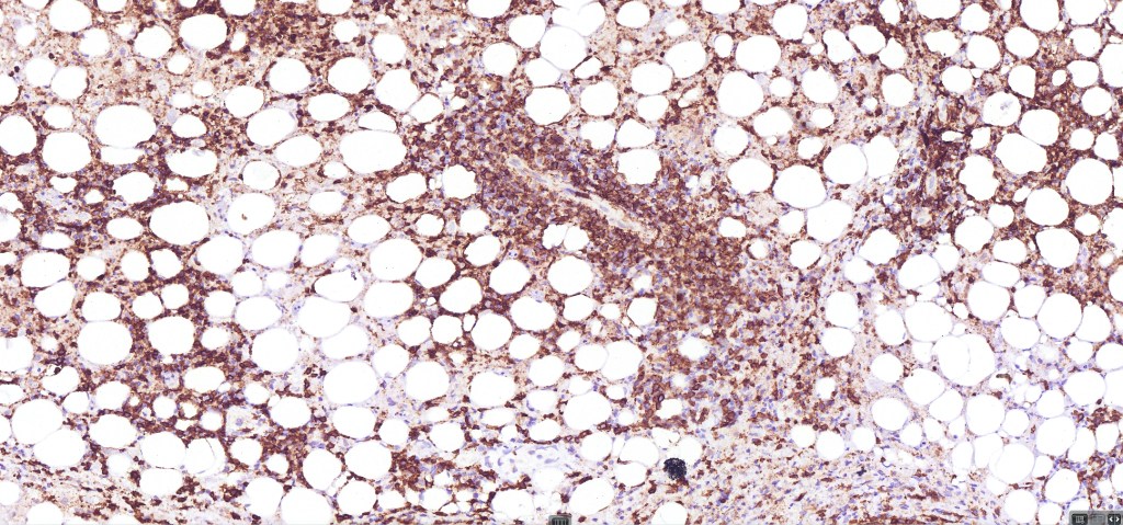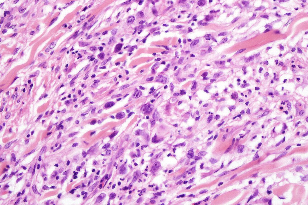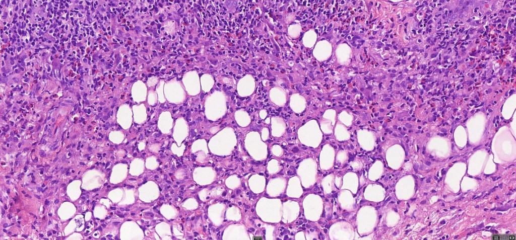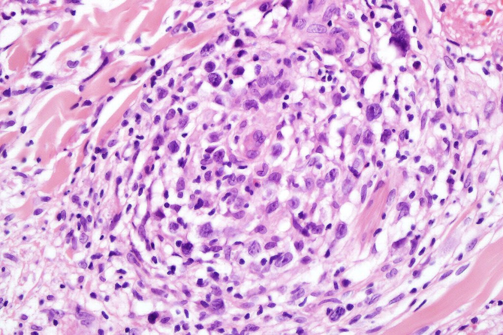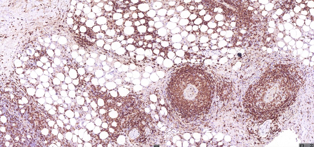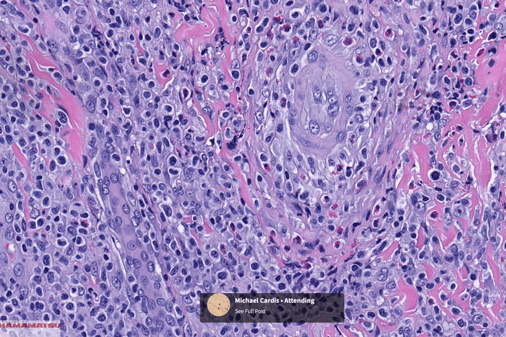 •Type A: 75-80%, wedge shaped infiltrate with base uppermost, large, anaplastic cells with abundant cytoplasm and vesicular nuclei containing prominent nucleoli, can resemble Reed-Sternberg cells, conspicuous mitoses & background infiltrate of lymphocytes, plasma cells, histiocytes, neutrophils & eosinophils